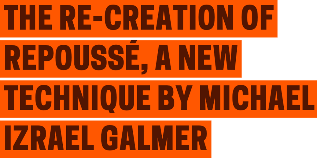 This silver vase and its associated drawings, mold and model are indicative of the detailed creative process that Michael Galmer goes through to create his magnificent works of art and design. His work, as demonstrated on this vase, features the handwork that replicates the dimpled surface of classic repoussé, normally achieved by hammering on the reverse side. Galmer achieves his effect through advanced casting techniques combined with traditional handwork such as chasing, resulting in a detailed relief similar to actual repoussé. The repoussé on Galmer’s works is reminiscent of pieces associated with Samuel Kirk of Baltimore and his followers in the mid-nineteenth and twentieth centuries. The Tall Bee vase also has the spirit of Japonisme that Tiffany and other major firms made so popular in Europe and American in the late 1870s and 1880s without being an exact replica. At the same time touches of early twentieth century Art Nouveau, the free flowing lines, the focus on nature, are also apparent. In the end, the vase is a modern amalgam of decorative styles, artistic techniques, and creative vision.