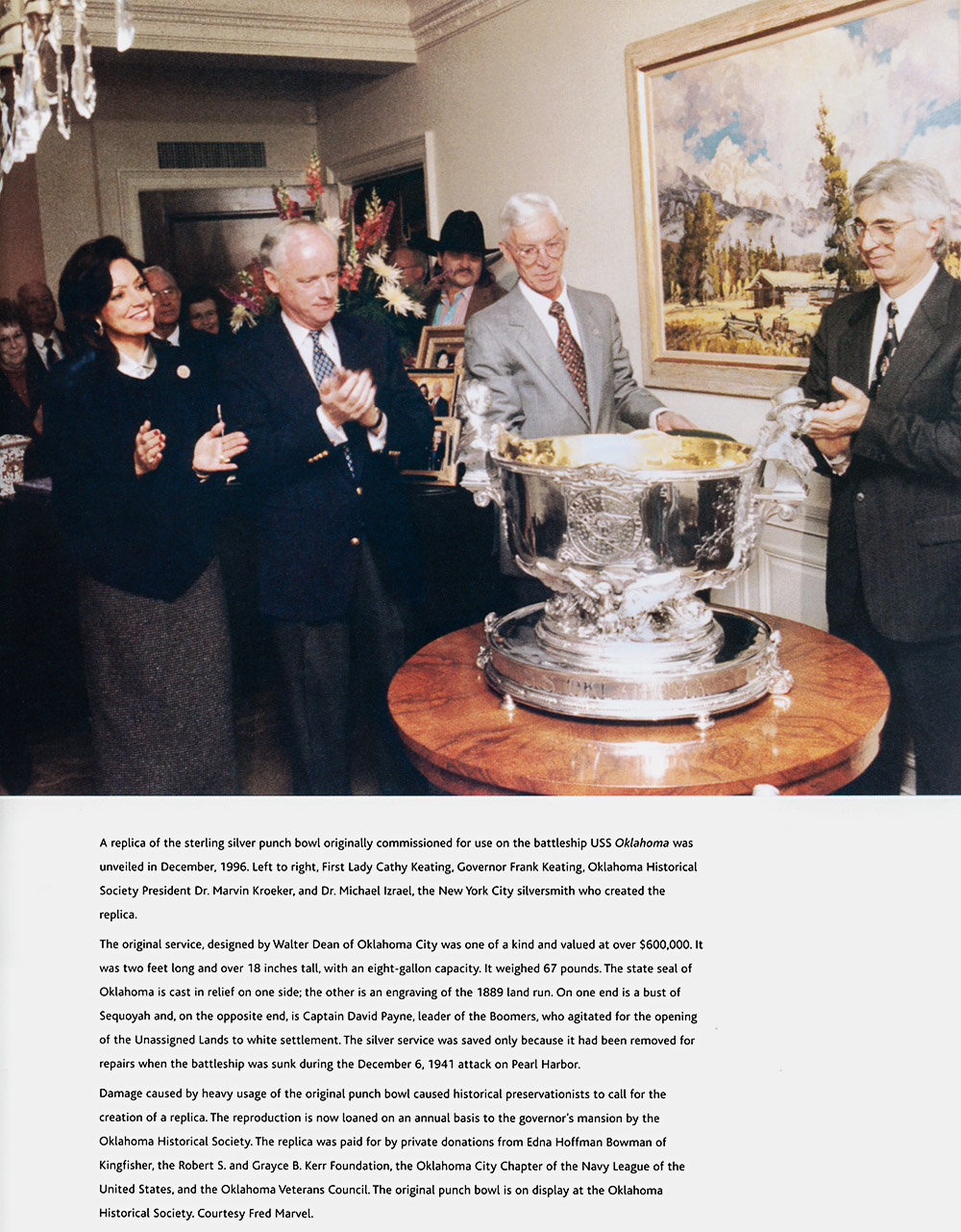 December 5, everybody got what they wanted: the original punch bowl remains at the State Museum of History in Oklahoma City; meanwhile, an exact replica (down to the scratches) by master silversmith Michael Izrael of New York City moved into the governor's mansion.